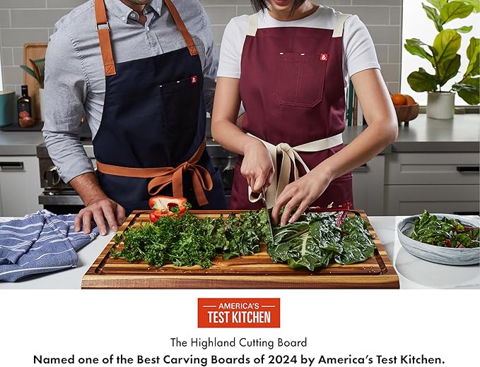 • DURABLE EDGE GRAIN TEAK – Known for outstanding moisture resistance and strength due to its natural high oil content, Teak is an ideal material for cutting boards. The wood is hard enough to allow for clean cuts, but is still soft enough to maintain a knife’s edge. With proper care (hand wash only) and monthly oiling, Highland will outlast most items in your kitchen. Our Teak is responsibly sourced from sustainable plantations. Finished safely. Free of BPA, phthalates, and formaldehyde.