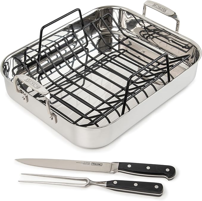 Viking 3-Ply Stainless Steel Roasting Pan with Nonstick Rack and Carving Set, 16 x 13 Inch Kitchen Cookware, Great for Turkey, Dishwasher and Oven Safe, Induction Ready, SIlver