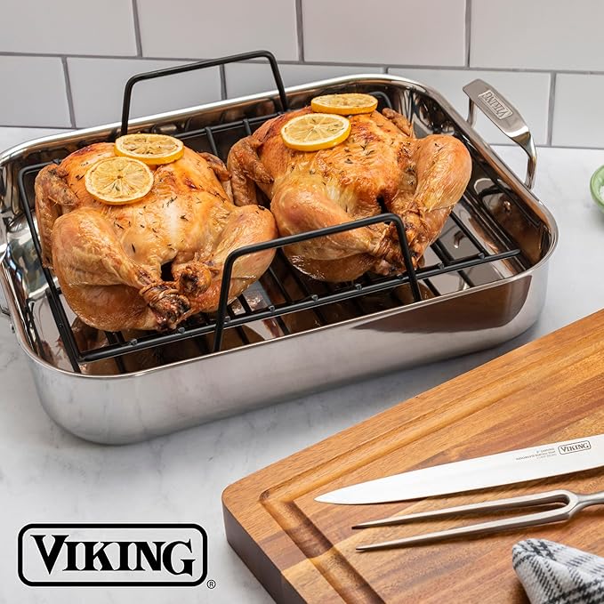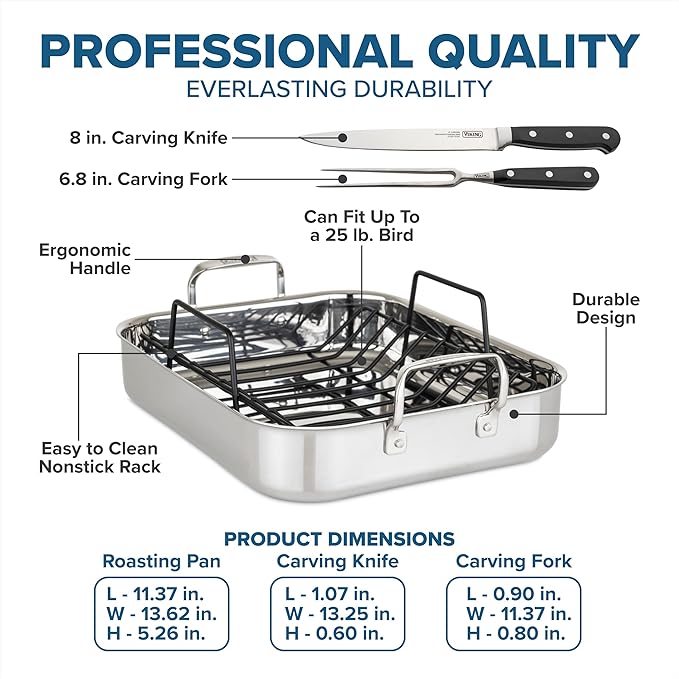 • ROASTER PAN WITH NONSTICK RACK AND CARVING SET: Prepare a juicy turkey or a tender roast with the Viking Stainless Steel Roasting Pan wth Nonstick Rack! Perfect for home cooks, this roasting pan features an elevated v-shaped nonstick wire rack which helps cook food quicker and more evenly, and includes a German steel 8 inch carving knife and 6.8 inch carving fork to impress your guests as you carve the perfect meal; cooking surface is non-reactive and ideal for reducing sauces or liquids
