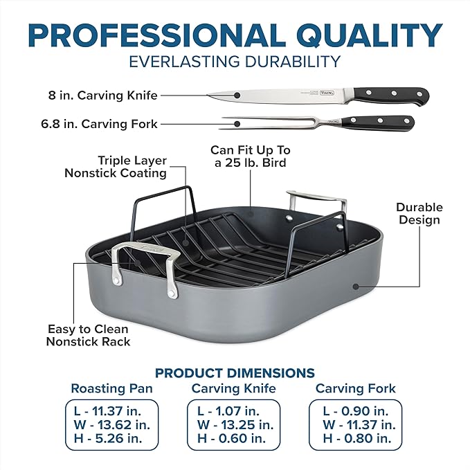 • ROASTER PAN WITH NONSTICK RACK AND CARVING SET: Prepare a juicy turkey or a tender roast with the Viking Hard Anodized Aluminum Non Stick Roasting Pan wth Nonstick Rack! Perfect for home cooks, this roasting pan features an angled elevated wire rack which helps cook food quicker and more evenly, and includes a X50CrMoV15 stainless steel 8 inch carving knife and 6.8 inch carving fork to impress your guests as you carve the perfect meal