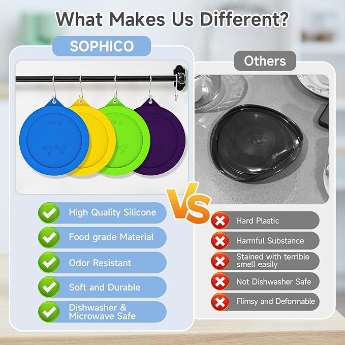 • RELIABLE SILICONE - Made from premium food grade silicone, which is odorless, non-toxic and BPA-Free. Compared with plastic lids, our silicone lids will not warp and crack over time of use.