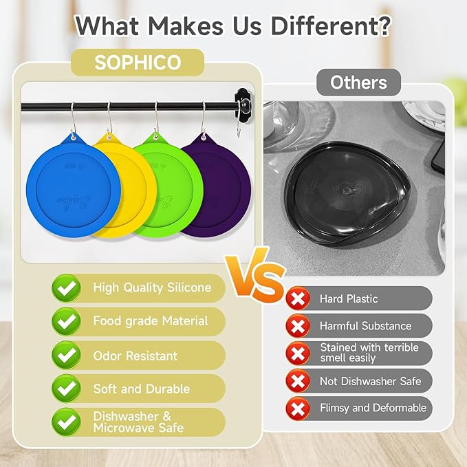 • RELIABLE SILICONE - Made from premium food grade silicone, which is odorless, non-toxic and BPA-Free. Compared with plastic lids, our silicone lids will not warp and crack over time of use.