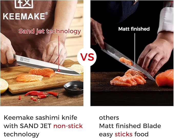 • 【Extremely Sharp Blade】Keemake experienced craftsman hand sharpened the edge with 12-15 degrees to ensure blade’s sharpness 80-100. Sushi knife boasts unrivaled performance and incredible edge retention