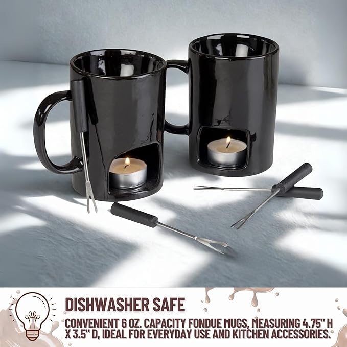 • All Occasions : Evelots set of 2 personal fondue mugs with 4 forks and 8 tealight candles. Each mug features a special compartment to hold a fondue tealight to keep your fondue at the right temperature. Whether you choose cheese or chocolate, our fondue mug set for 2 is sure to melt your heart and that of your sweetheart! Ideal for romantic meals, Valentine's Day, anniversaries or birthdays. Makes a perfect gift. Sold on Amazon for over 6 years