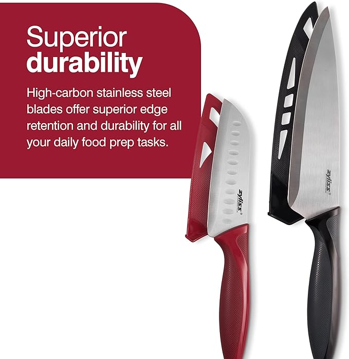 Zyliss Utility Kitchen Knives with Sheath Covers - Dishwasher Safe - Stainless Steel Kitchen Knives Perfect for Cutting Meat, Vegetables & Fruit - 2 Piece Santoku & Chef Set
