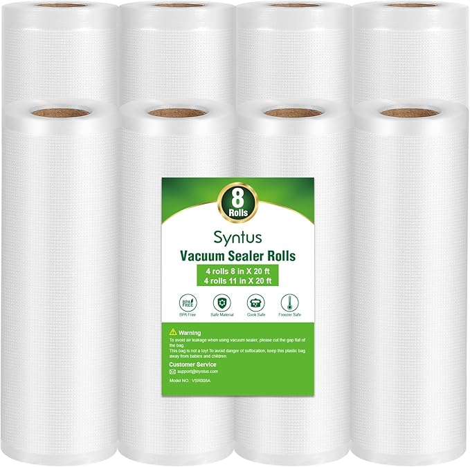 Syntus Vacuum Sealer Bags, 8 Pack 4 Rolls 11" x 20' and 4 Rolls 8" x 20' Commercial Grade BPA Free Bag Rolls, Food Vac Bags for Storage, Meal Prep or Sous Vide