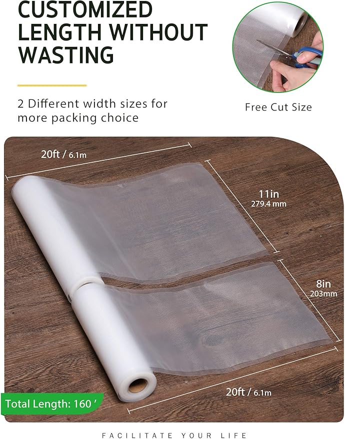 - Customizable Length for No Waste: Our package includes 4 rolls of 8" x 20' and 4 rolls of 11" x 20' (totaling 160'), providing you with versatile options to accommodate different food sizes. The roll packing design allows you to cut the bags to any length you need, minimizing waste and ensuring that you can package everything from small portions to large items without any unnecessary excess material. This flexibility makes our vacuum sealer bag rolls an economical choice for all your food storage needs.