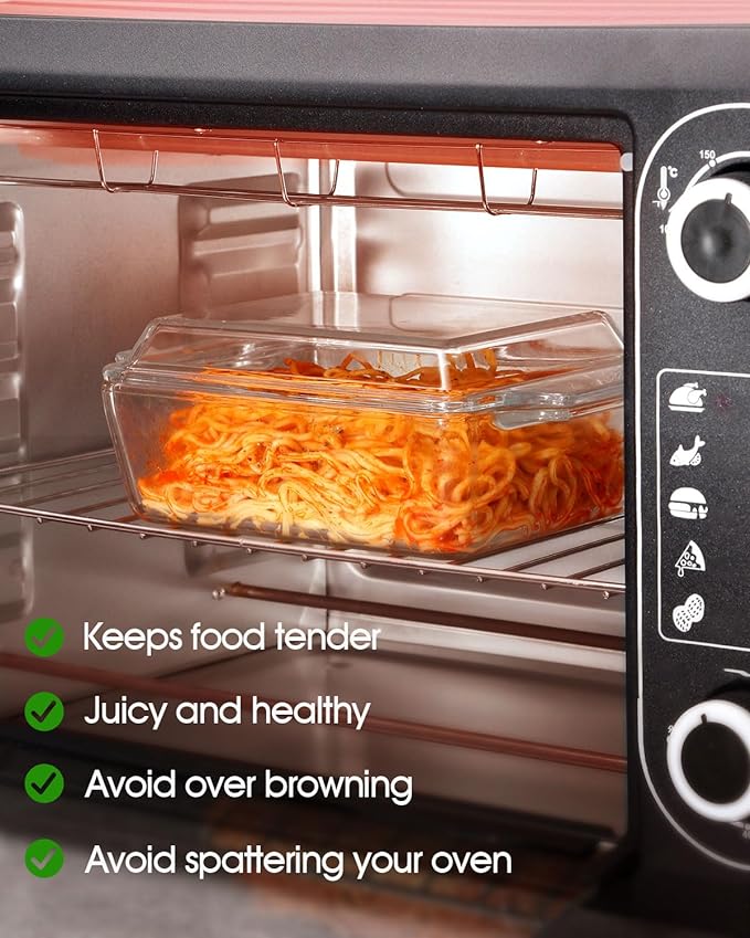 • TENDER, JUICY AND HEALTHY: The glass lid is a big plus for keeping the food moist while baking and microwaving in this glass microwave bowl. Your food will come out tender, juicy and healthy. Even sauce comes out creamy, not dry. You can save so much time throwing vegetables into the microwave with a little olive oil and water versus stove top cooking!