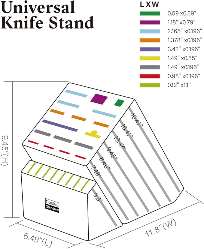 • Universal Knife Holder: Acacia wood knife storage with variety of widths hold chef’s, steak, wide and long knives, and a cleaver