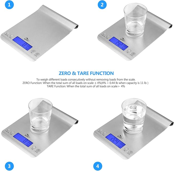 • 【Syncs with Nutritional】Built with high precision strain gauge sensor, food scale weighs up to 11lb/5kg, graduation: 1g/0.1oz.