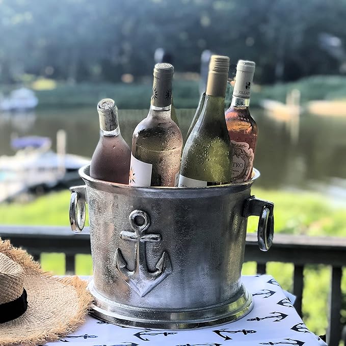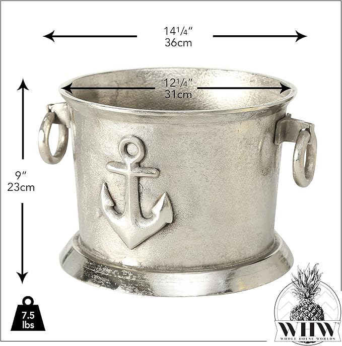 Luxury Champagne Bucket Wine Cooler, Nautical Flair, Anchor Crest, Hand Cast Aluminum, Old World Craft Finish, Up to 8 Bottles, 14.25 L x 12.25 W x 9.0 H inches, 7.5 lbs