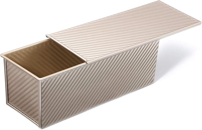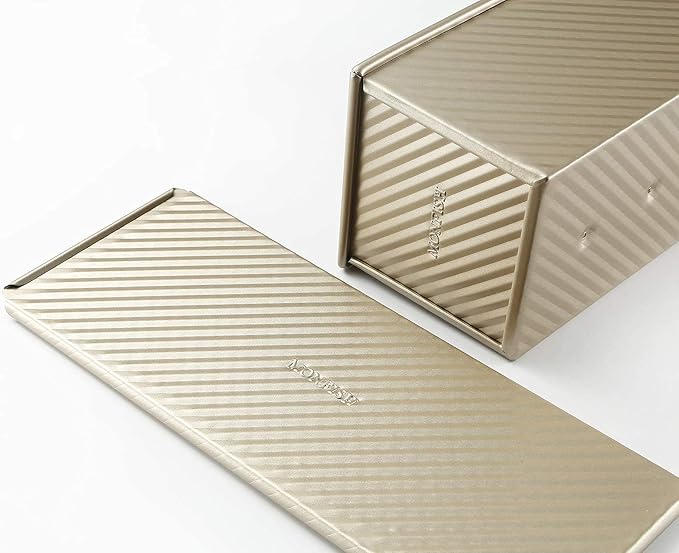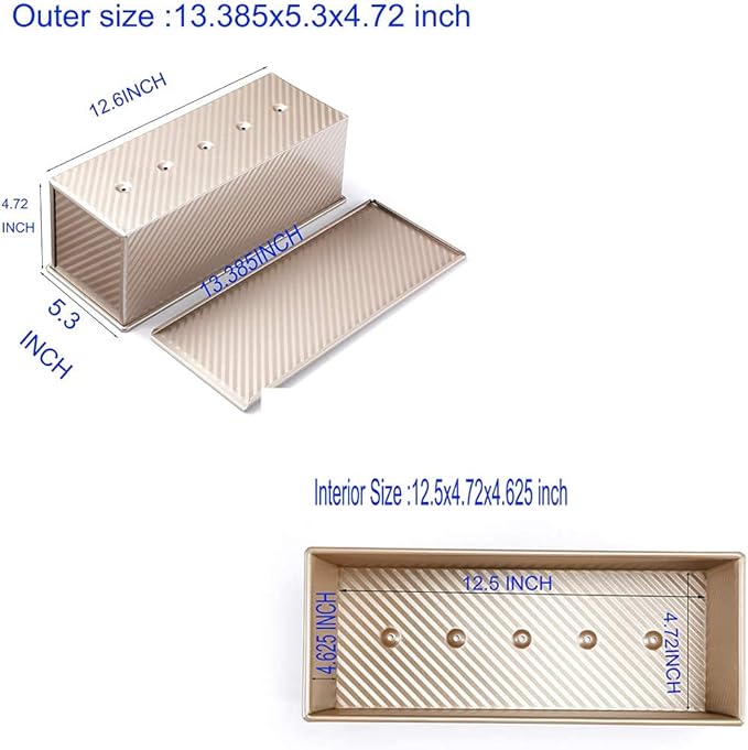 • STYLISH WAY TO BAKE - Complement the overall theme of your kitchen with this elegant 13.5x5.5x4.75 inch pullman pan. It features a nice champagne gold color that will blend naturally with the rest of your bakeware.The big size suits for 4-8 people family.