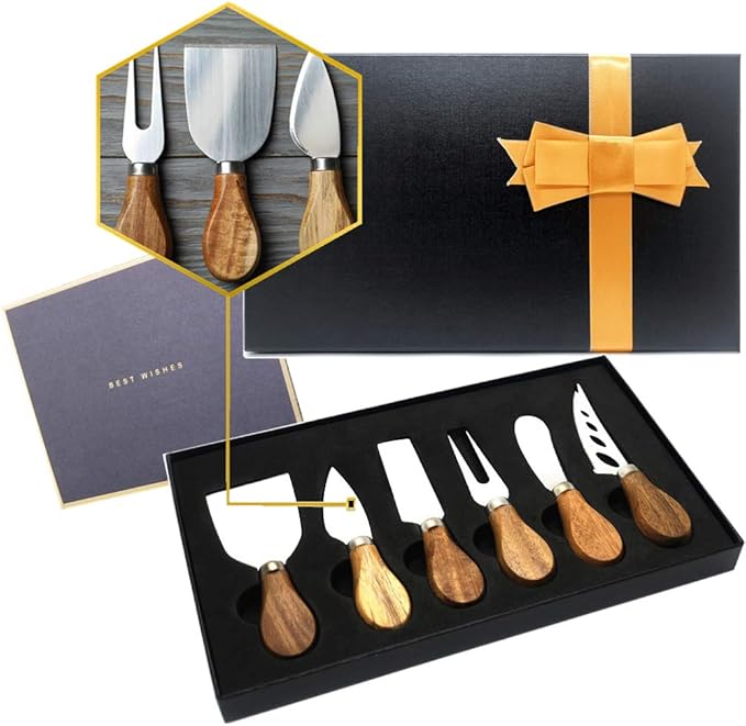 Premium 6-Piece Cheese Knife Set,Complete Stainless Steel Cheese Knives Collection (Acacia Wood Handle)-Charcuterie Boards Accessories,Gift-Ready