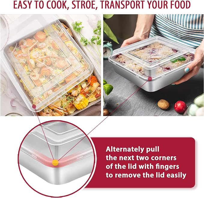• GREAT BONUS - Rectangle and square pan both come with secure plastic covers, Making storage and transport of baked goods convenient, No plastic wrap or foil required, Fridge & Freezer Safe to keep your food fresh, See-through lid lets you can see what's inside and how much is left without removing it