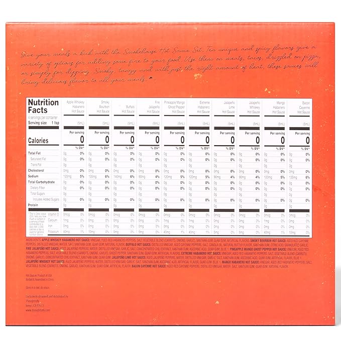 • Flavor : Buffalo, Apple Whiskey Habanero, Pineapple Mango Ghost Pepper, Bacon Cayenne, Smoky Bourbon, Jalapeno Lime, Fire Jalapeno, Jalapeno Whiskey, Extreme Habanero, Mango HabaneroBuffalo, Apple Whiskey Habanero, Pineapple Mango Ghost Pepper, Bacon Cayenne, Smoky Bourbon, Jalapeno Lime, Fire Jalapeno, Jalapeno Whiskey, Extreme Habanero, Mango Habanero See more