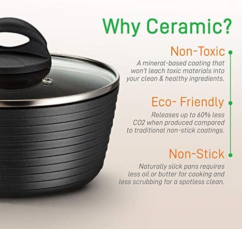 • NON-STICK COATING: The non stick pot set cooking ware features a durable and long lasting nonstick coating for easy food release or tossing, cleaning & healthy cooking. It has a hard anodized exterior which makes the cookware resistant to high heat