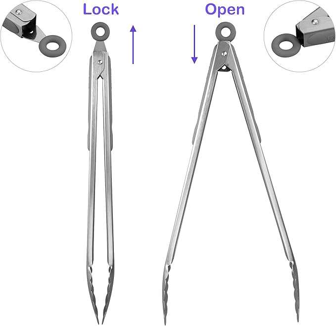 304 Stainless Steel Kitchen Cooking Tongs, 14" and 16" Set of 2 Sturdy Grilling Barbeque Brushed Locking Food Tongs with Ergonomic Grip, Grey