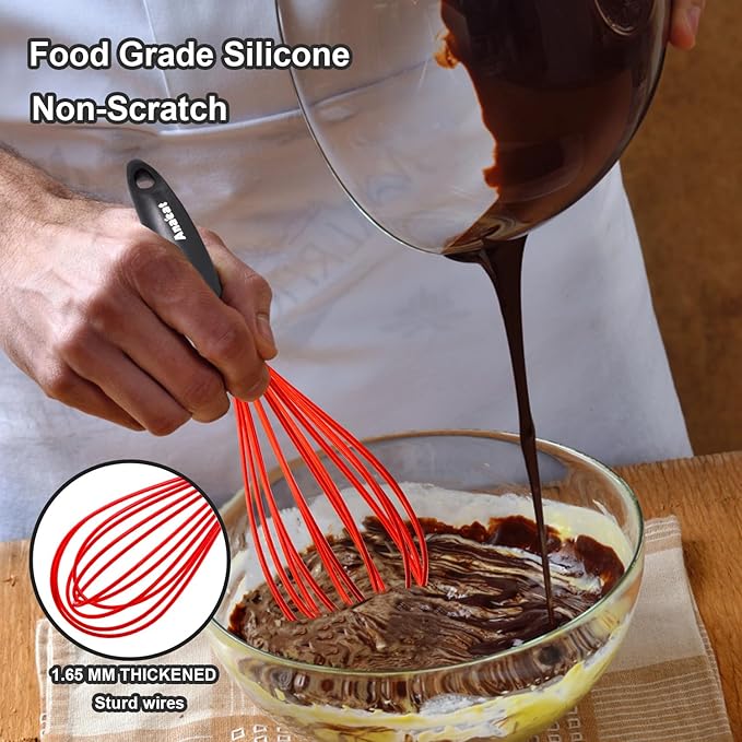 Anaeat Silicone Whisk, Thick Stainless Steel Wire Inner - Heat Resistant Kitchen Whisks for Non-Stick Cookware, Balloon Egg Beater for Whisking, Blending, Beating, Frothing & Stirring (Red)