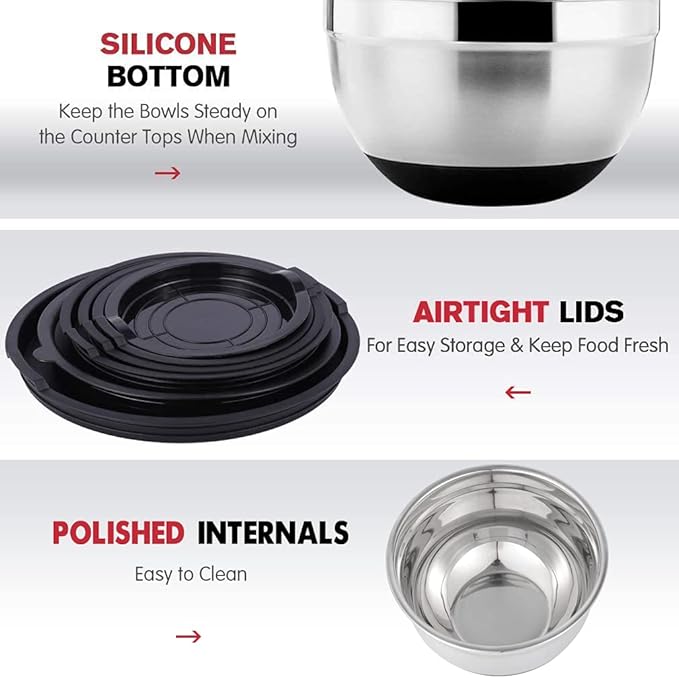 • [MULTIFUNCTION & EASY CLEAN] Steel bowls are prefect to mix, toss salads, stir, whip, knead dough, marinate and store. Ideal present for New home, Easter, Thanksgiving Day, Christmas or any occasion. Simple to clean by hand and dishwasher safe. Please hand-wash the lids to minimize exposure to heat.