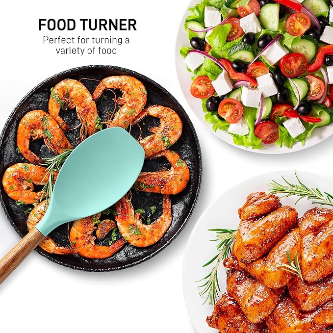 Zulay Kitchen Non-Stick Cooking Utensils Set with Authentic Acacia Wood Handles – 5-Piece Durable & Stylish Silicone Kitchen Utensils Set – Heat Resistant to 464°F – Aqua