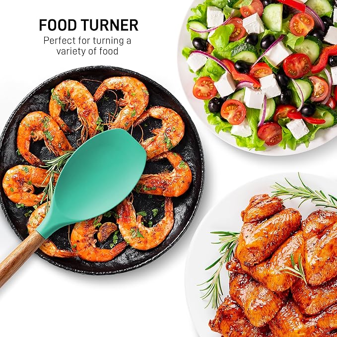 Zulay Kitchen Non-Stick Cooking Utensils Set with Authentic Acacia Wood Handles – 5-Piece Durable & Stylish Silicone Kitchen Utensils Set – Heat Resistant to 464°F – Mint
