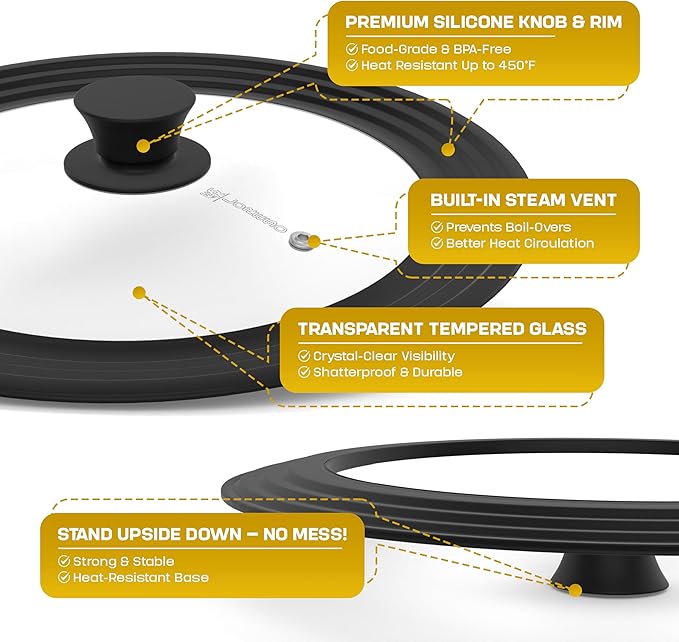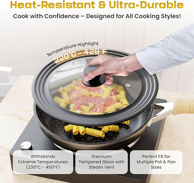 • Built for High-Heat Cooking: Premium tempered glass withstands temperatures up to 428°F without warping or cracking, making these universal pot lids perfect for everything from gentle simmering to high-temperature searing while maintaining their structural integrity