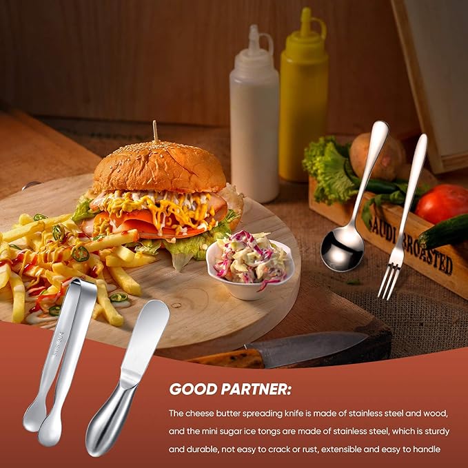 • Proper size: the butter spreader knives measure approx. 5.28 inches/ 13.4 cm long and the handles measure approx. 0.94 inch/ 2.4 cm wide, the stainless steel serving tongs measure approx. 4.33 x 0.62 inches/ 11 x 1.6 cm, the stainless steel forks measure approx. 5.11 x 0.4 inches/ 13 x 1 cm and the stainless steel spoons measure approx. 4.33 x 1.02 inches/ 11 x 2.6 cm, proper sizes make them easy to store and take little space in your kitchen