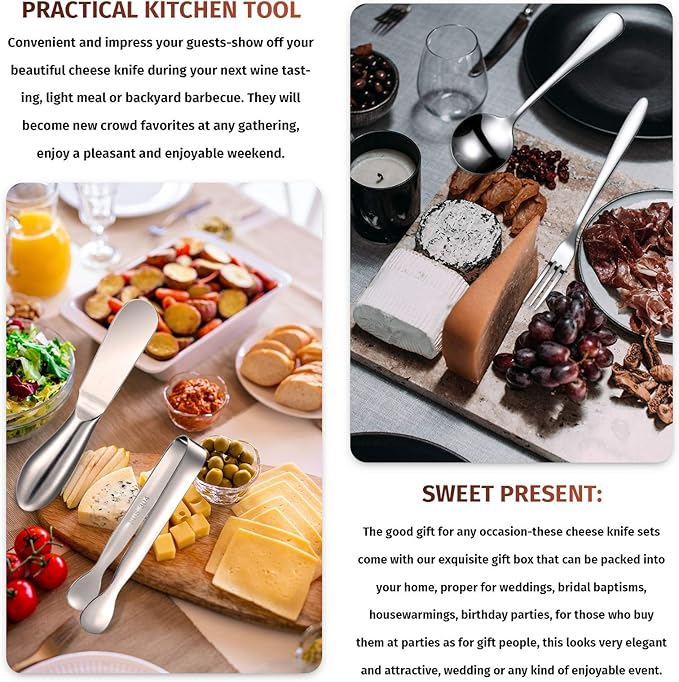 • 14 Pieces cheese butter spreader knives set: includes 4 pieces cheese butter spreader knives with stainless steel handles, 2 pieces mini serving tongs, 4 small spoons and 4 small forks for serving, applied in butter, cheese, butter, jelly, butter and pastry making; It is enough to satisfy your daily use and can be given to relatives and friends as gifts, which can bring a lot of convenience