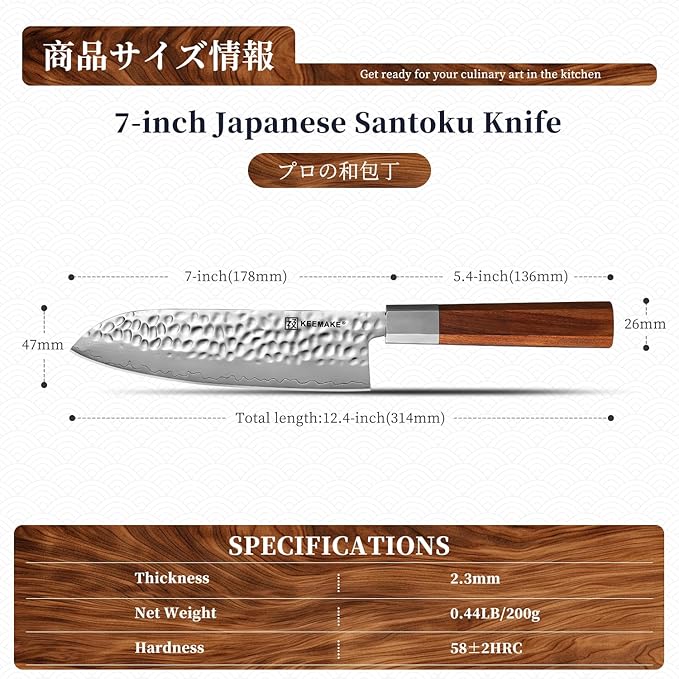 • 【Premium Material】KEEMAKE KIKU series 7 inch Japanese santoku knife is crafted out of premium forged German high carbon molybdenum vanadium stainless steel. Molybdenum and vanadium have the effect of increasing strength (sharpness and abrasion resistance) and increase sticky(hard to chip). We often recommend molybdenum steel Japanese Kitchen knives because of their characteristics: ease of re-sharpening, good durability, and rust resistance, and edge retention
