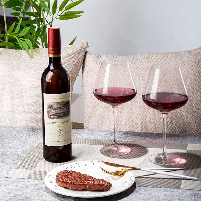 • Handcrafted --- Each wine glass is hand-blown by an experienced master craftsman, by whom the edge is delicately polished and cut for a thin and smooth appearance to provide a better sense of touch for your lips and enhance the quality and flavor of the wine.