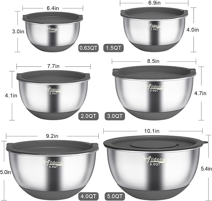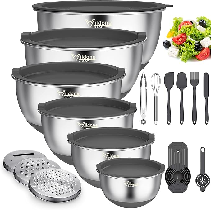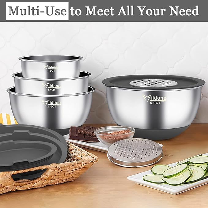 Wildone Mixing Bowls with Airtight Lids, 22 PCS Stainless Steel Mixing Bowls Set, 3 Grater Attachments, Measurement Marks & Non-Slip Bottom, Size 5, 4, 3, 2,1.5, 0.63QT, Ideal for Mixing & Prepping