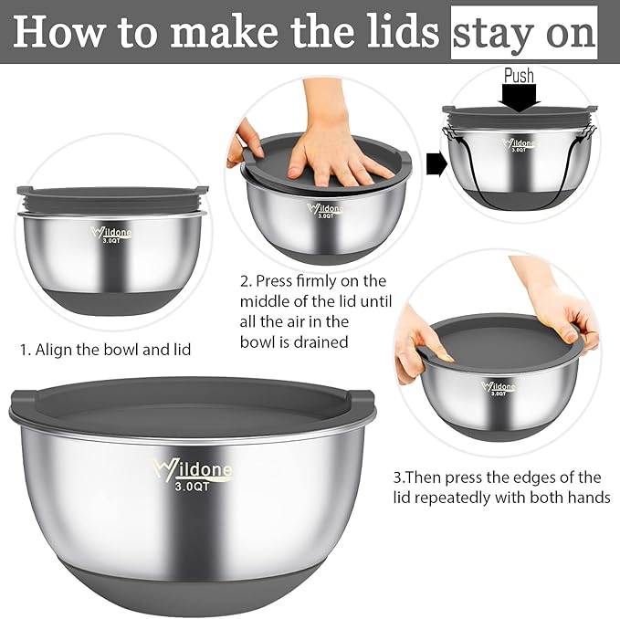 • Silicone Bottoms & Clear Scale: The non-slip silicone bottom keeps the stainless bowls steady on counter tops when beating and whisking. Quarts and liters are clearly engraved inside the bowls and fade proof, meet the demand of different measurement. You can mix, beat, or whisk ingredients with little mess as the wide, deep bowls have high walls to prevent splatter