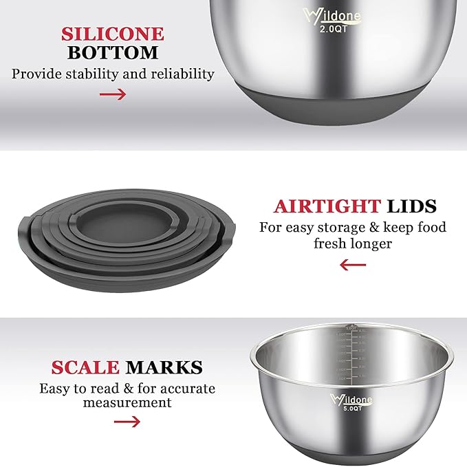 • Durable and High Quality: Wildone bowls set is constructed of mirror-finish interior and matte-finish exterior, features an attractive and elegant look enhancing your kitchen. Made of high-quality stainless steel for lasting use, which is dent resistant and rustproof, easy to clean