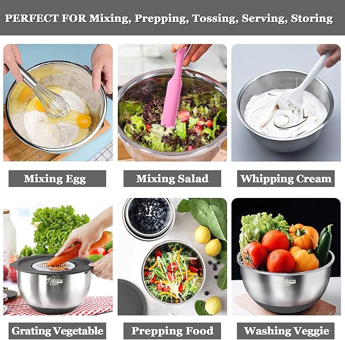 • Airtight Lids & Multiple Inserts: Airtight Lids that fit snugly to keep an airtight seal and keep food fresh, so this set can be used as dry storage bowls with lids on. Our bowl set also comes with 3 different grater inserts (Slicing, Grating, Shredding) that fit snugly into the lid of the largest bowl, it’s more convenient for you and your family
