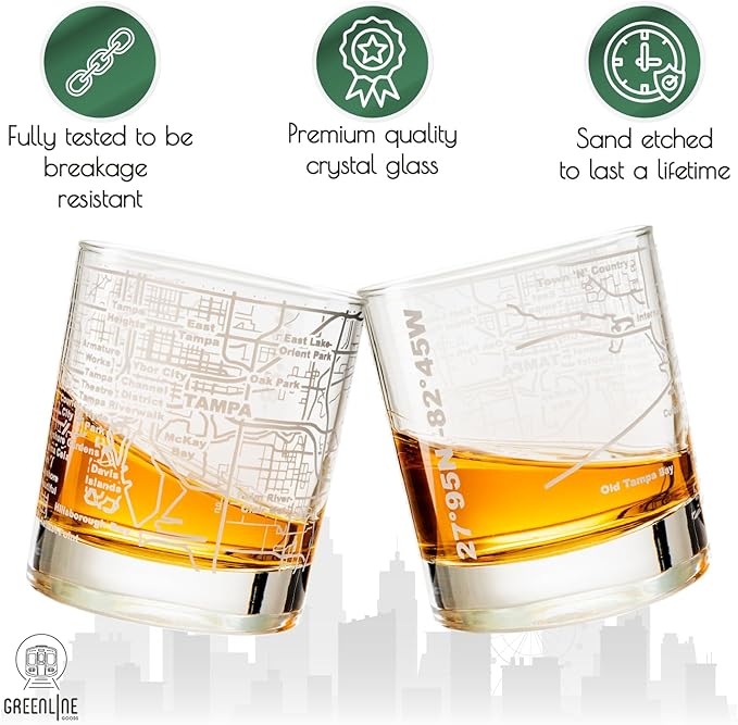 Greenline Goods Whiskey Glasses - 10 Oz Tumbler Gift Set for Tampa lovers, Etched with Tampa Map Old Fashioned Rocks Glass - Set of 2