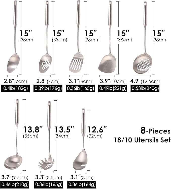 18/10 Stainless Steel Kitchen Utensils Set - 15” All Metal Cooking Tools & Serving Utensils, 8 PCS - Solid Spoon, Slotted Spoon, Spatula, Ladle, Skimmer, Tunner, Spaghetti Spoon, Large Spoon Set