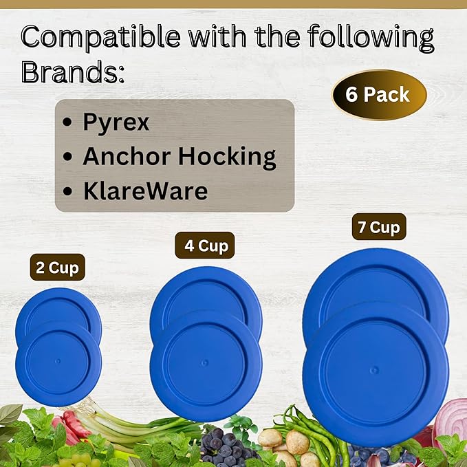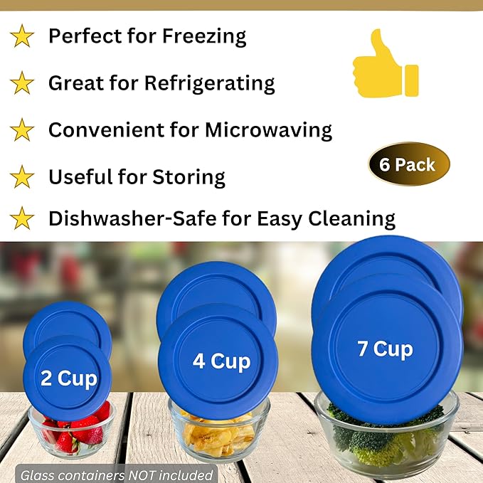 2, 4 & 7 Cup Blue Replacement Lids/Covers for Pyrex, Anchor Hocking & KlareWare Storage Bowls *Lids Only Glass Container Not Included* (6 Pack *Two of Each Size*)