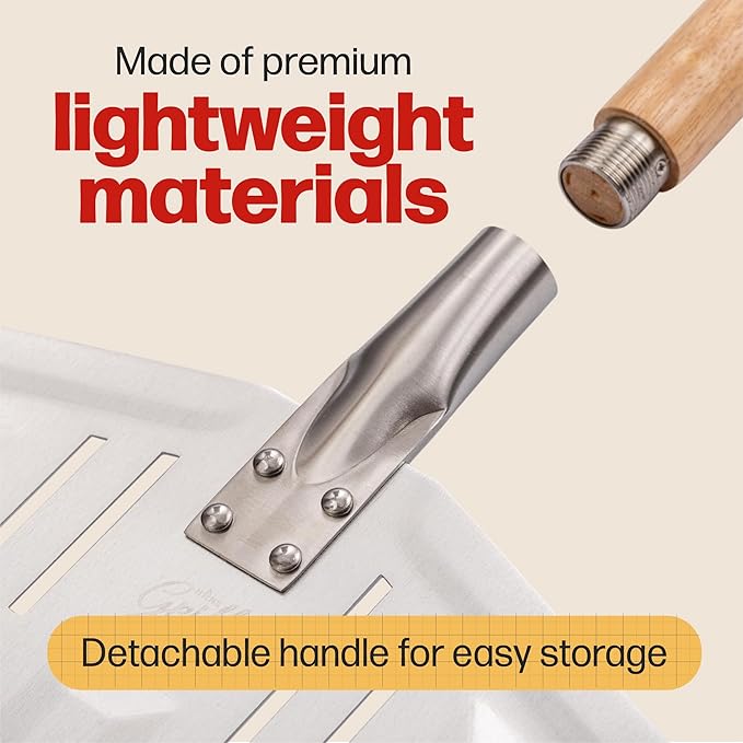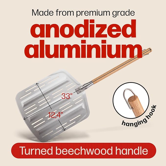 • PREMIUM QUALITY: Made from premium grade Anodised Aluminium, with a turned beechwood handle for comfortable and safe handling. Our pizza peels are made to last, meaning you can launch and retrieve delicious home made pizzas again and again.