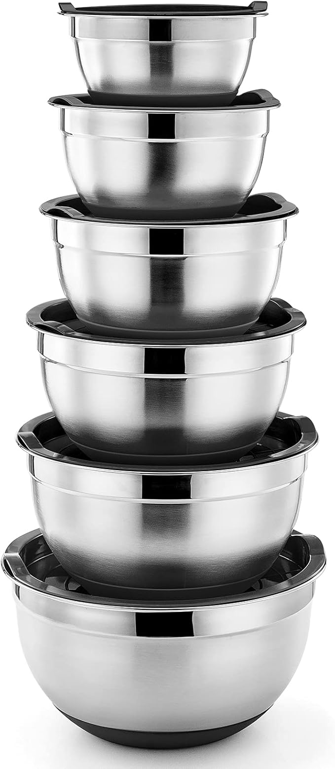 P&P CHEF Mixing Bowls With Lids, Set of 6, Stainless Steel Nesting Mixing Bowls & Fitting Lids & Non-Slip Silicone Bottom, Ideal for Mixing, Storing, Size 0.7/1/1.5/2.5/3/4.6 Qt, Black