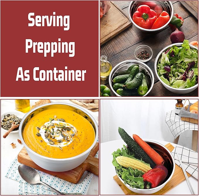 • 【GOOD DESIGNS】Plastic lids tightly fit the bowls for a airtight storage, Good ideal to keep the food fresh, tasty and dry, Silicone base combined with the flat bowl bottom, that make the bowl not easy slipping and wobbling while whisking and mixing, Inner mirror finished design made the bowl easy cleaning up, Outside brushed surface is elegant for kitchen