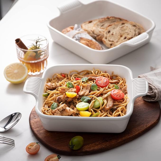 Sweejar Ceramic Baking Dish, 8 x 8 Cake Baking Pan for Brownie, Porcelain Square Bakeware with Double Handle for Casserole, Lasagna, Family Dinner (White)