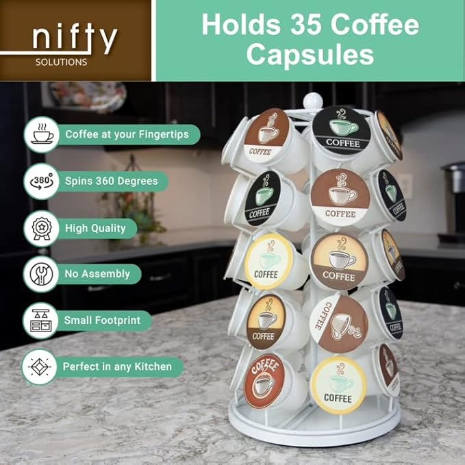 • COFFEE POD CAROUSEL: This Nifty carousel is compatible with K-Cups and stylishly showcases up to 35 of your favorite coffee pods. The lazy Susan base platform revolves and spins 360-degrees, which makes it simple and convenient to find and choose your preferred flavor.