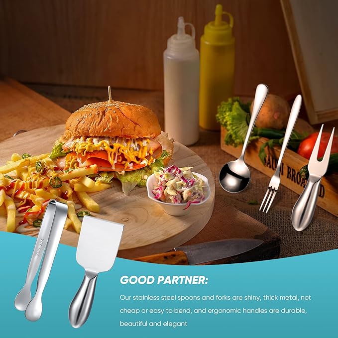• Package includes: you will receive 4 pieces of butter spreader knives with stainless steel handle, 4 pieces of cheese spreader knives with stainless steel handle, 4 pieces of spoons, 4 pieces of forks, and 4 pieces of mini serving tongs, sufficient quantity and various styles to meet your needs in daily life