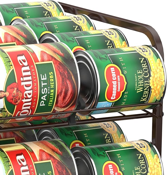 • 【UPGRADED ORGANIZER】Strong and stable, not easy to rust and bend. The new upgraded stackable can rack organizer is made of metal, the surface is covered with brown electroplating. sturdy and not bent, strong load bearing capacity, waterproof and non-slip, not easy to rust.