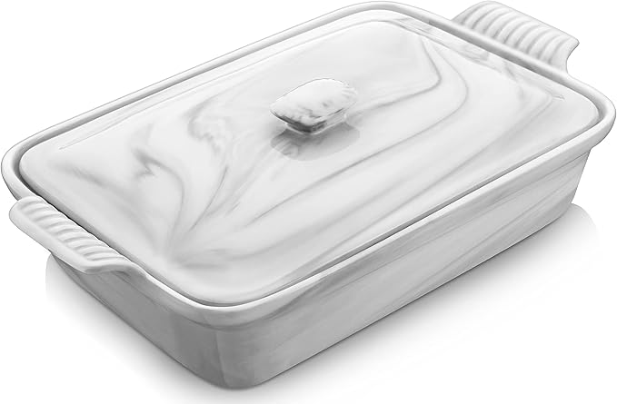 • 【High-QUALITY CERAMIC MATERIAL】Crafted from premium ceramic, nonstick and smooth glaze surface resist scratches. This baking dish ensures even heat distribution and excellent heat retention for perfectly cooked meals every time. Included lid helps lock in moisture and flavors, allowing for a more flavorful and tender result. It also keeps food warm during serving and makes storage a breeze.