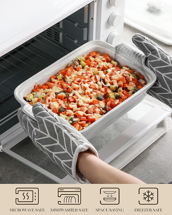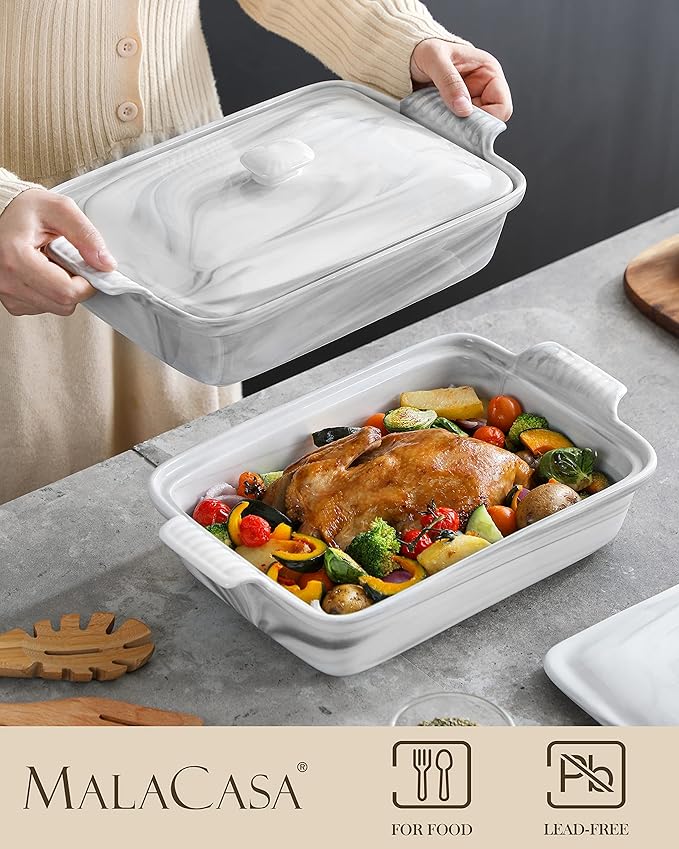 • 【VERSATILE CASSEROLE DISH】MALACASA Ceramic casserole dish with lid is a multi- functional bakeware set perfect for baking, roasting, and serving various dishes, including lasagna, casseroles, spaghetti, meat, vegetable and more. ideal for storing and reheating leftovers.