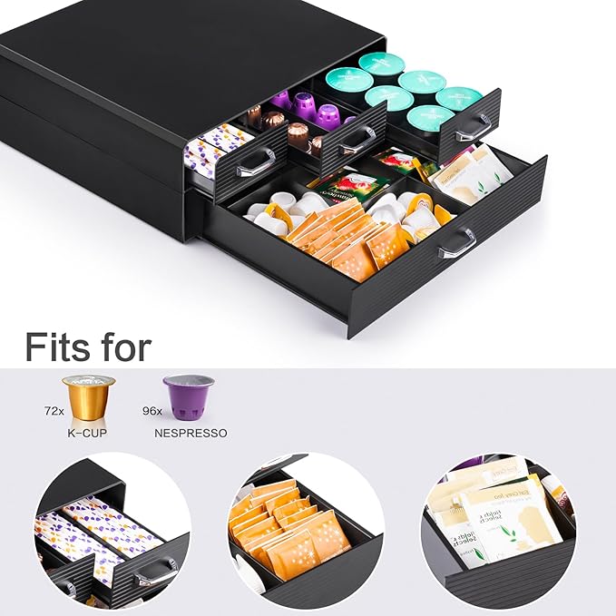 • 2 Tiers & 4 Drawers: Integrated with 3 small drawers and 1 multi-functional large drawer , this 2-tier coffee pod organizer is compatible with K-cup (up to 72 pods) & Nespresso small capsule (up to 96 pods). And the drawer opens smoothly.