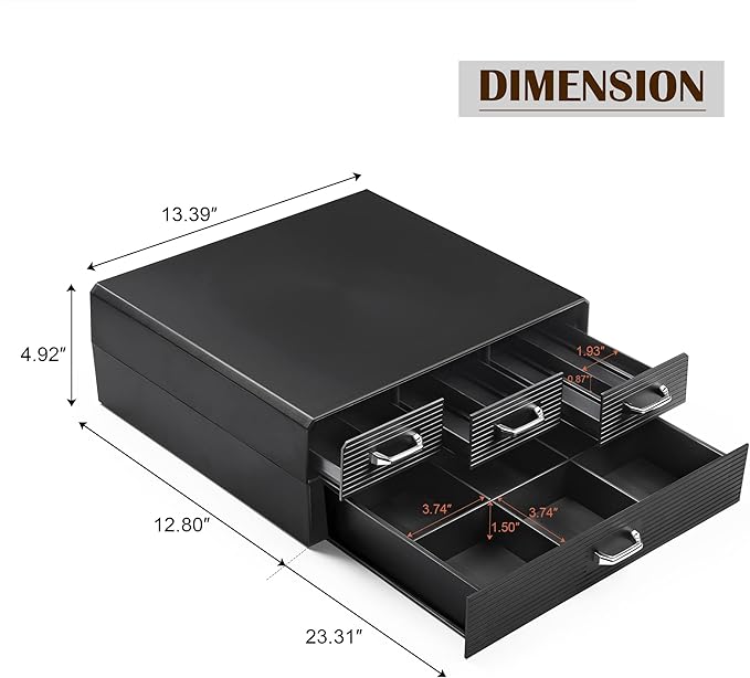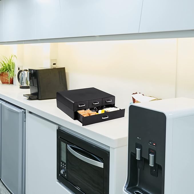 • Sleek Design: Mirror-finish handles; simple black appearance; smooth drawer-pulling even with a coffee machine on it.This black coffee pod organizer is a nice choice for your modern kitchen.