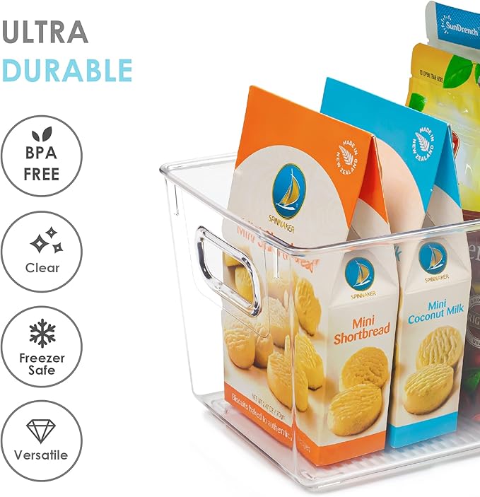 • Clear and Sturdy ---- Made of premium BPA free durable polyethylene material, these refrigerator organizers are lightweight and sturdy. They are clear, so you can see what you want without having to take the whole bin out of the fridge. Use side by side to create a storage solution that works best for you.