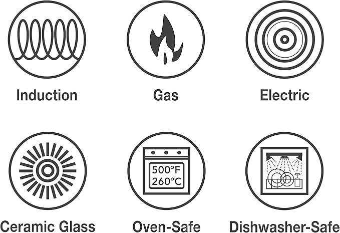 • Versatile Compatibility: Suitable for all cooktops, including gas, electric, induction, and ceramic glass. Oven safe up to 500°F (260°C) and easy to clean in the dishwasher